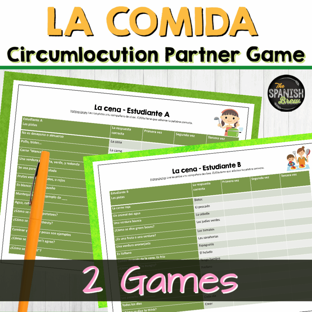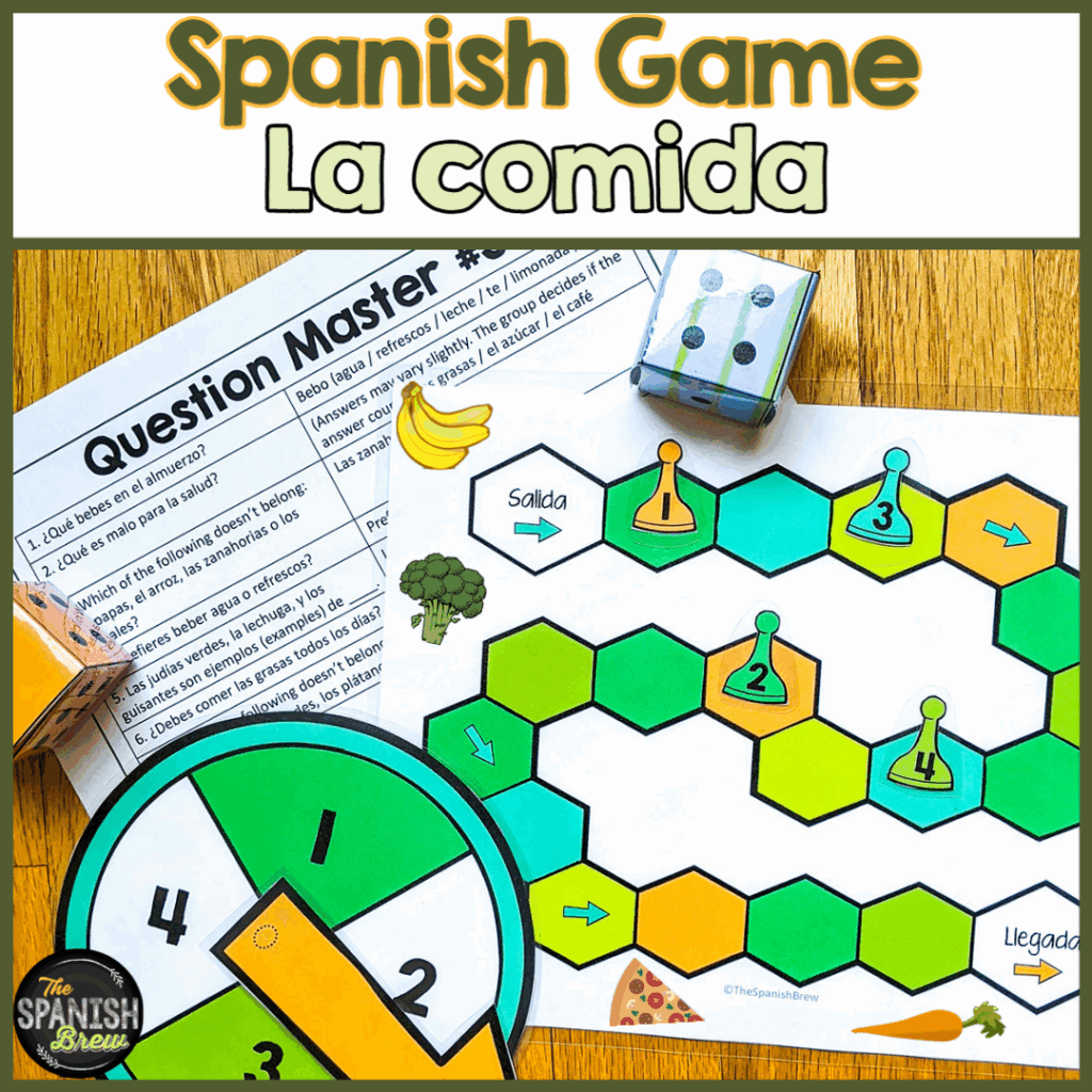 Students move around the board answering questions and defining Spanish food vocabulary in a circumlocution-style game. They’ll practice describing food items without saying them—kind of like “Catch Phrase” for Spanish learners. It’s one of those fun activities that makes language learning feel like a game (because it is). Your middle school and high school students will love getting competitive with their Spanish skills.