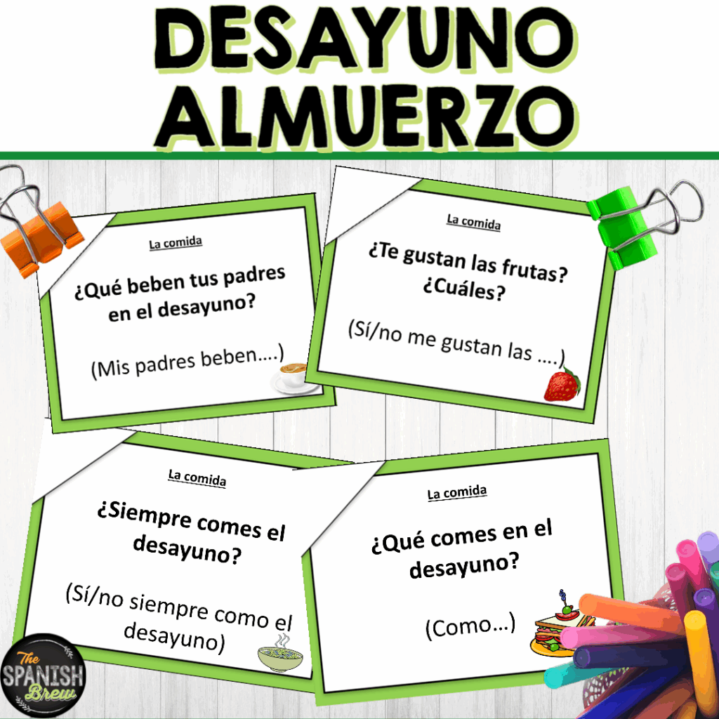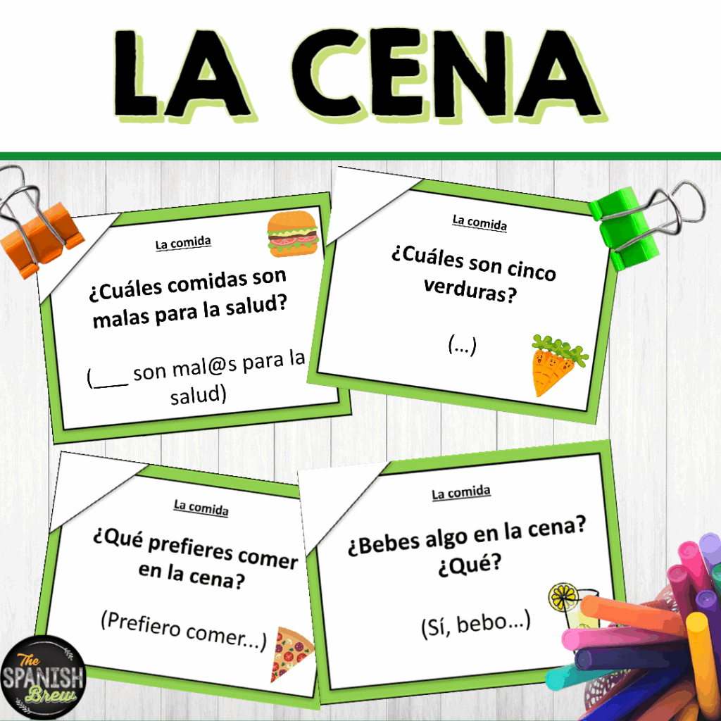 These printable task cards are a great resource for small groups or whole-class vocabulary practice. Each card prompts students to speak using Spanish food words and encourages them to use complete sentences. I absolutely love them because my students can work independently using the quiz-quiz-trade method with the cards. This includes cards targeted on breakfast, lunch, dinner, and restaurant vocabulary in Spanish.