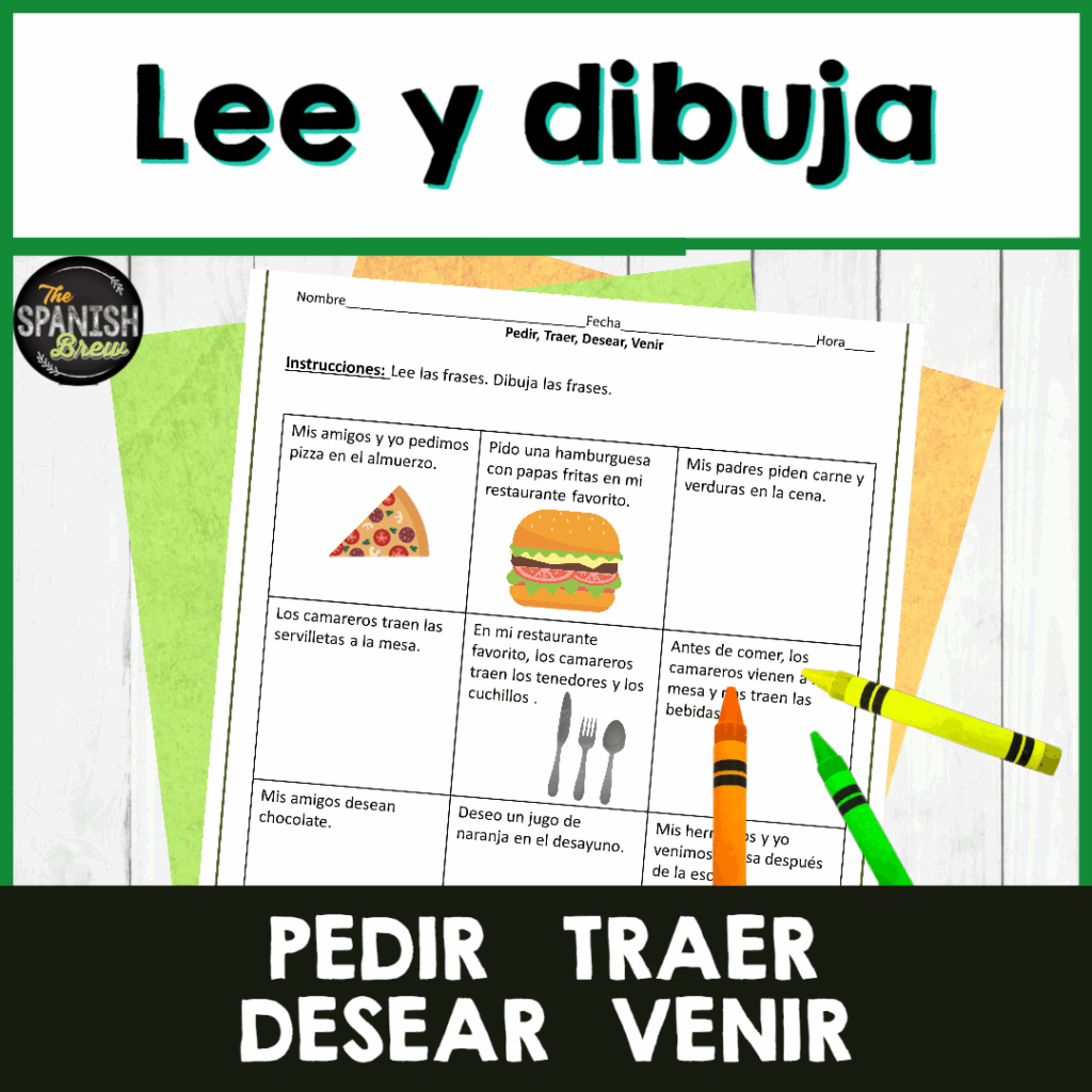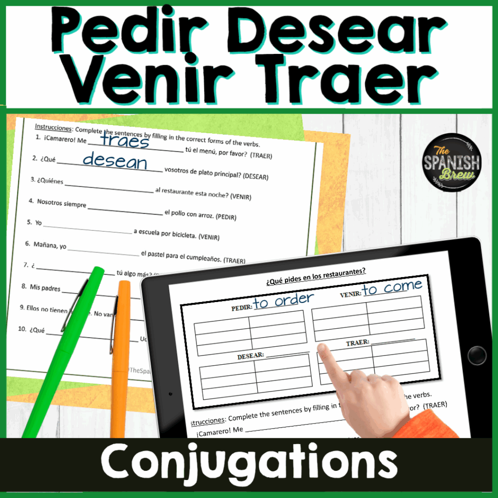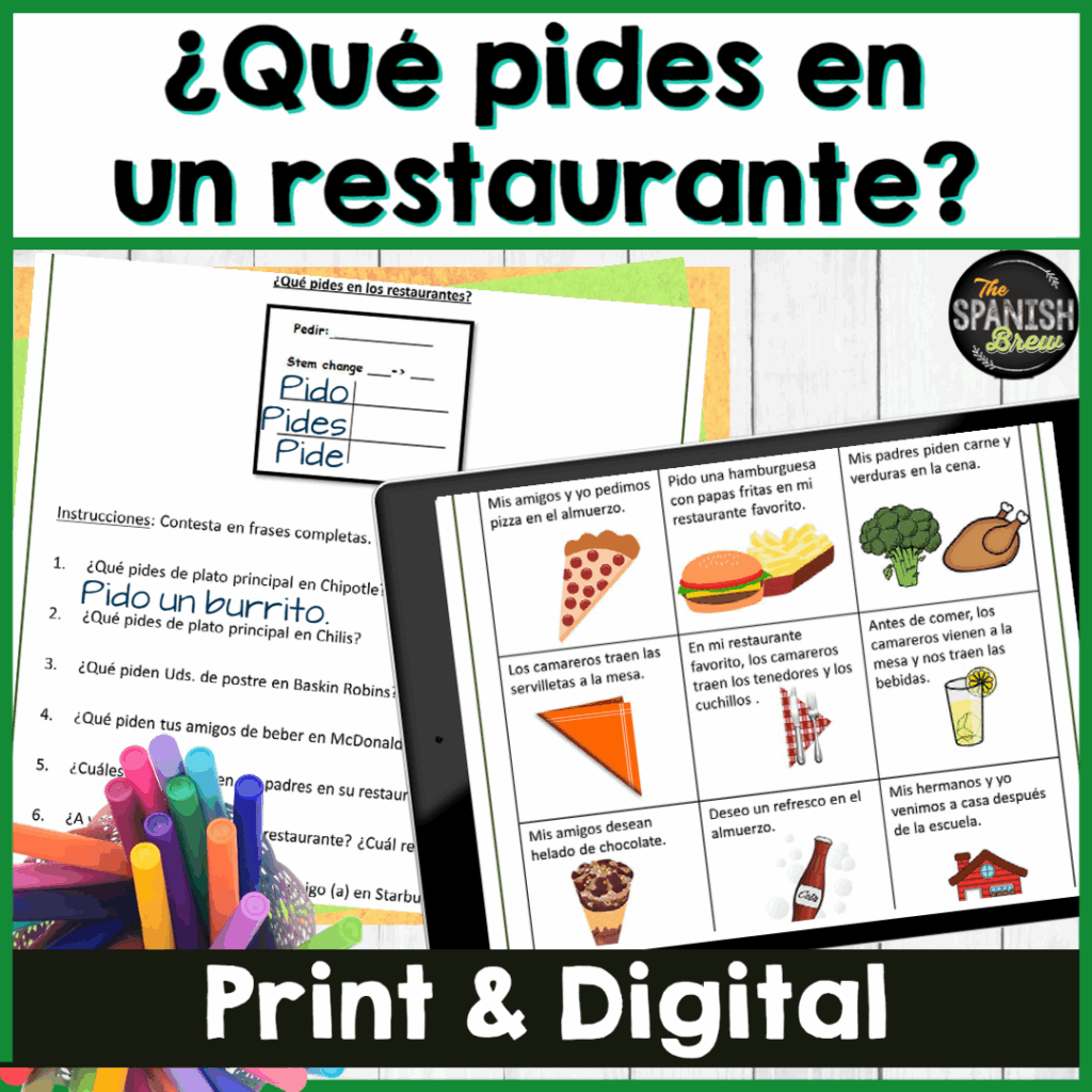 Let your students practice ordering food in a restaurant with these highly engaging activities! They’ll use the verbs pedir, servir, and traer while acting out conversations between customers and waiters. It’s the best part of combining grammar and speaking practice. Plus there are a variety of creative worksheets to get them writing using these high frequency verbs.
