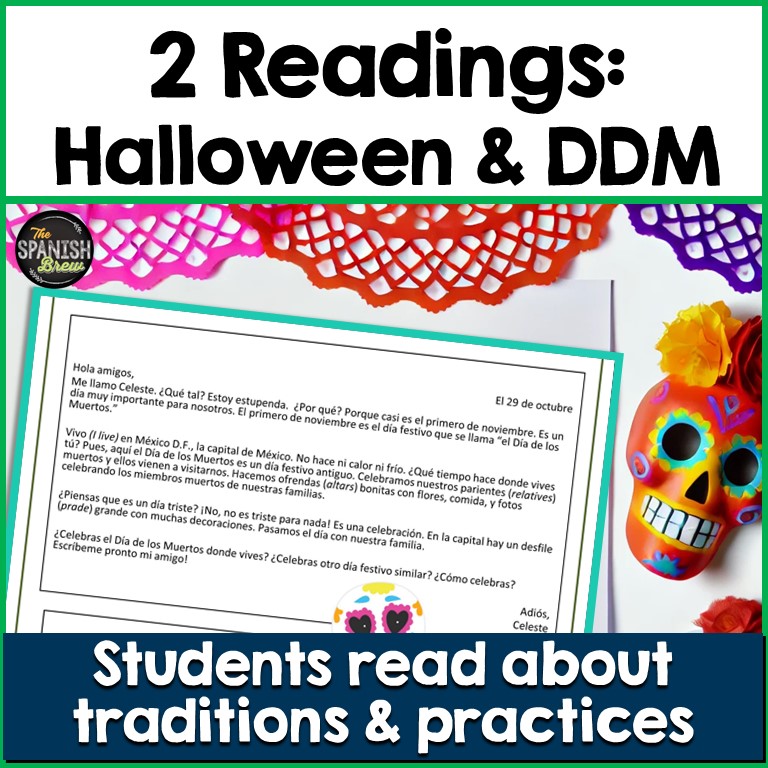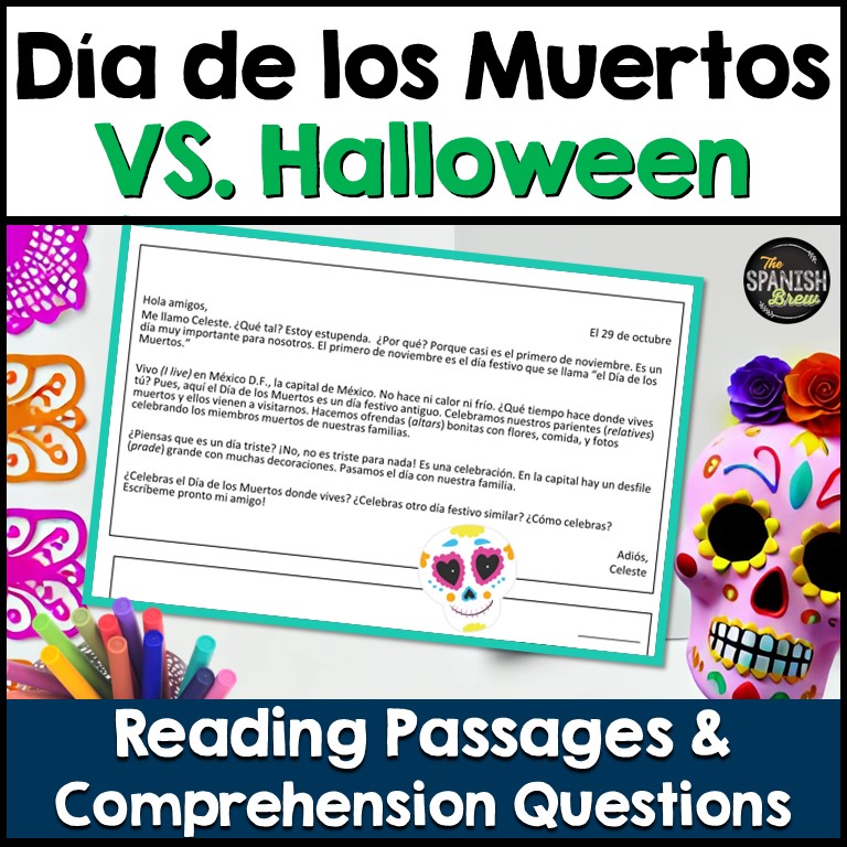 While Halloween is fun, Día de los Muertos offers a meaningful way to explore Spanish culture and different holidays in Latin America. This reading comprehension activity provides an in-depth look at this important tradition. Give your Spanish students TONS of comprehensible input while reading with these 2 Dia de los Muertos reading activities. Then they write a letter back to a student in Mexico and the United States, answering questions and making comparisons to where they live. An awesome way to make a cross-cultural comparison between Halloween and Día de los Muertos.