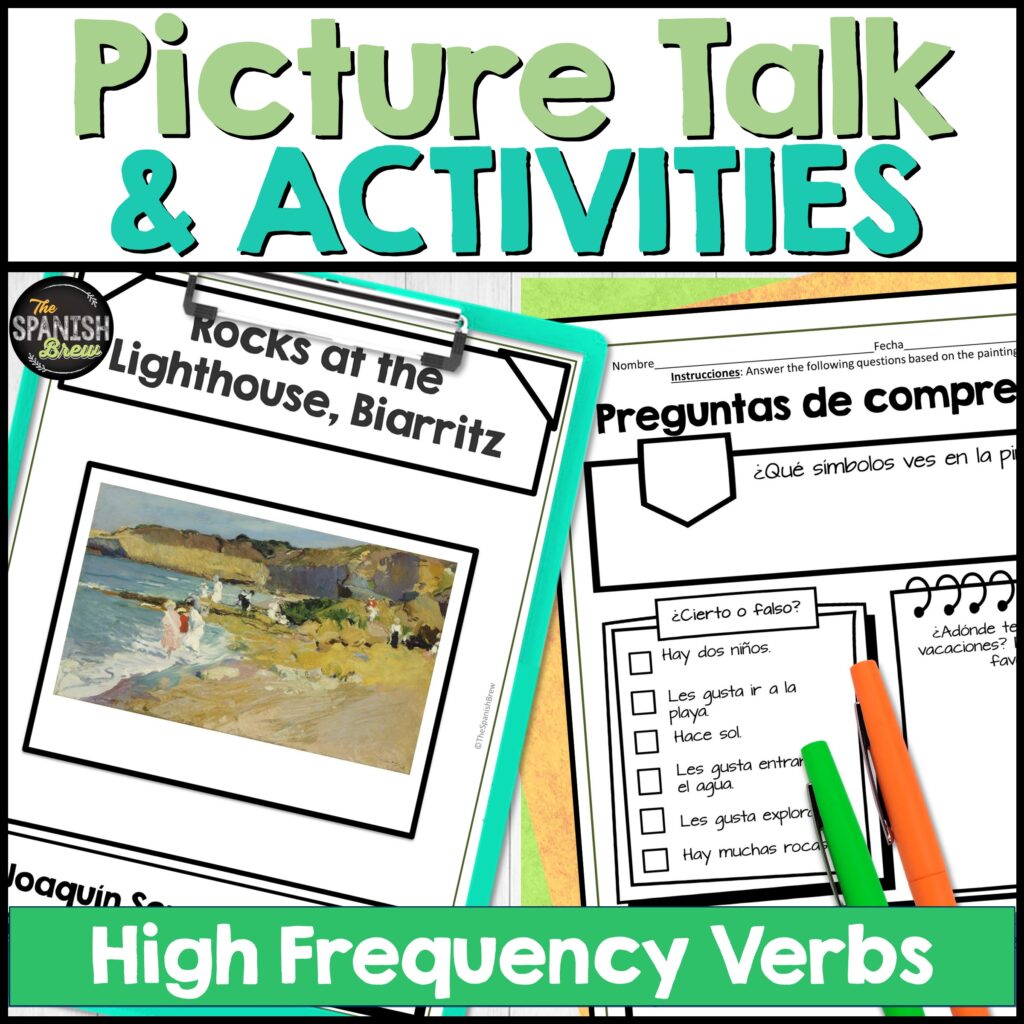 The teacher projects the authentic paintings by famous painters and then “circles” the high frequency verbs & key Spanish vocabulary with questions for the class. A long list of sample questions using high frequency words are included so you don’t have to do any of the heavy lifting. I absolutely love this activity because it is an easy way to stay in the target language and hit that 90% goal without the class feeling stressed or relying on English translations. After the class discussion of the painting, students demonstrate Spanish comprehension with a quick worksheet by answering true/ false questions, writing statements, and identifying key symbols in the painting. Finally, they answer personal questions, making connections to the painting.